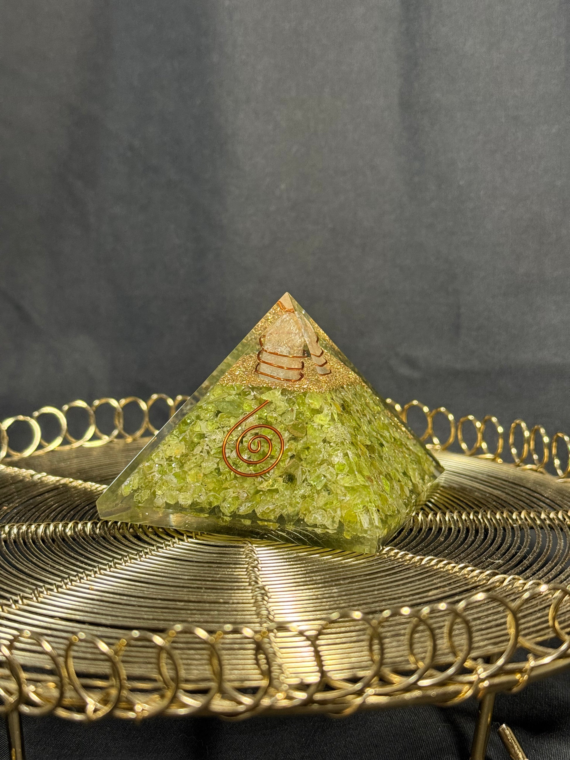 Diese handgefertigte Orgonit - Pyramide vereint Peridot, Bergkristall und Kupfer zu einem harmonischen Feld aus Reinigung, Schutz und lebensfreude.